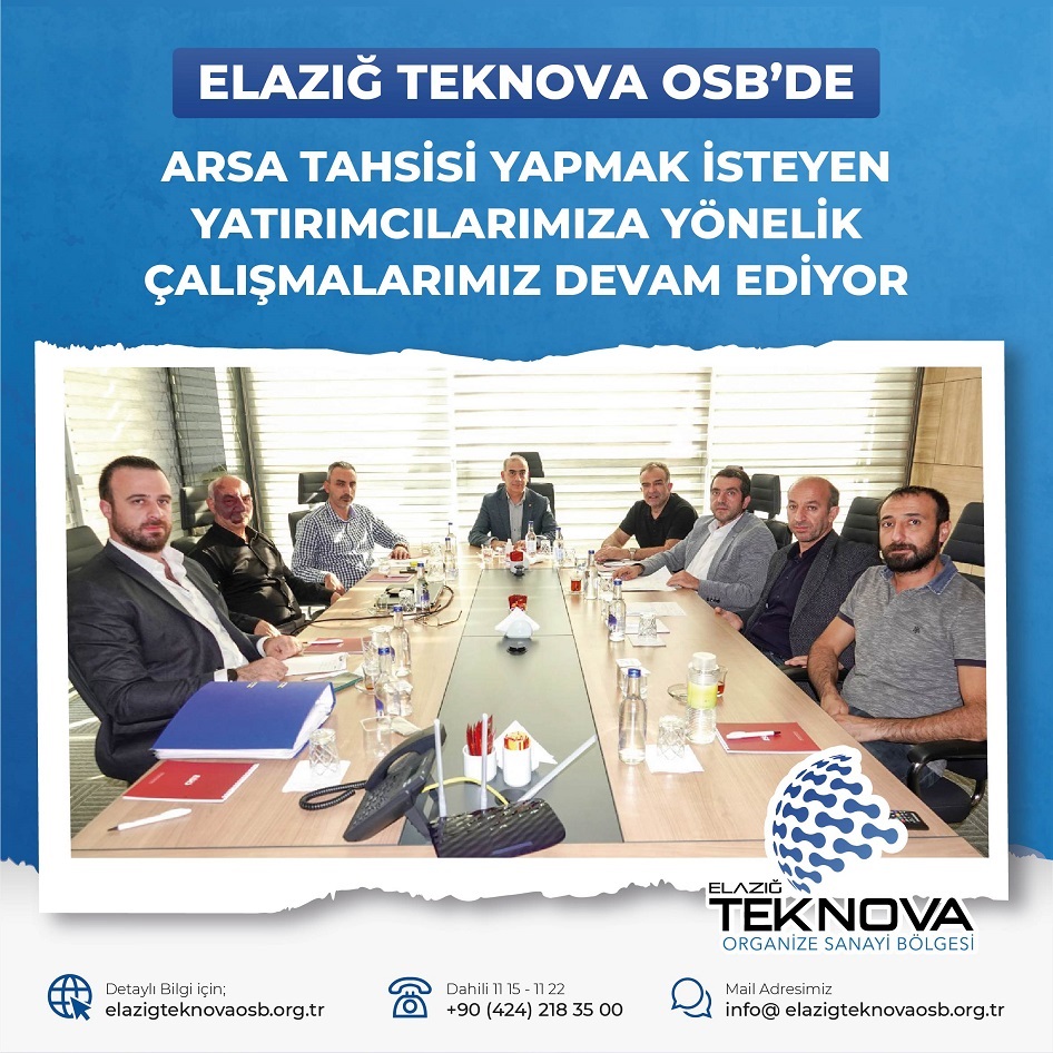21 Eki Haberler Arsa Tahsisi Değerlendirme Toplantımızı Gerçekleştirdik. 21.10.2022 Tarafından gönderildi Elazığ Teknova OSB Mart 15, 2026 0 Elazığ Teknova OSB'mizde yatırım yapmak isteyen "Başkan Gıda, Güneş Mutfak, Yasar... Okumaya devam et